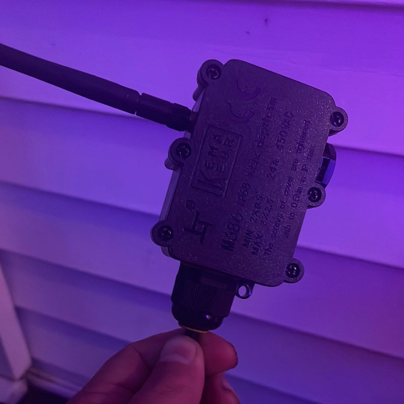 Four port 3 pin controller to control Minleon permanent lights. Requires an 8.3 amp power supply (inverter) which is not included. The 8.3 amp power supply can support up to 400 lights without any power injections.