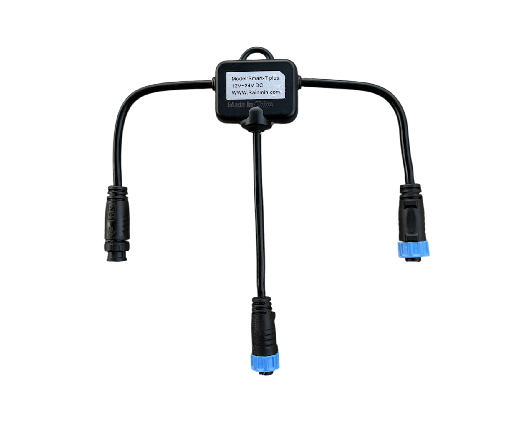 A Smart-T is used immediately after a controller, and can be connected in series with up to dozens of Smart-Ts. This can help create a curtain or 2D display with several light strings going in different directions where the lights do not use a duplicate light address like a basic-T.