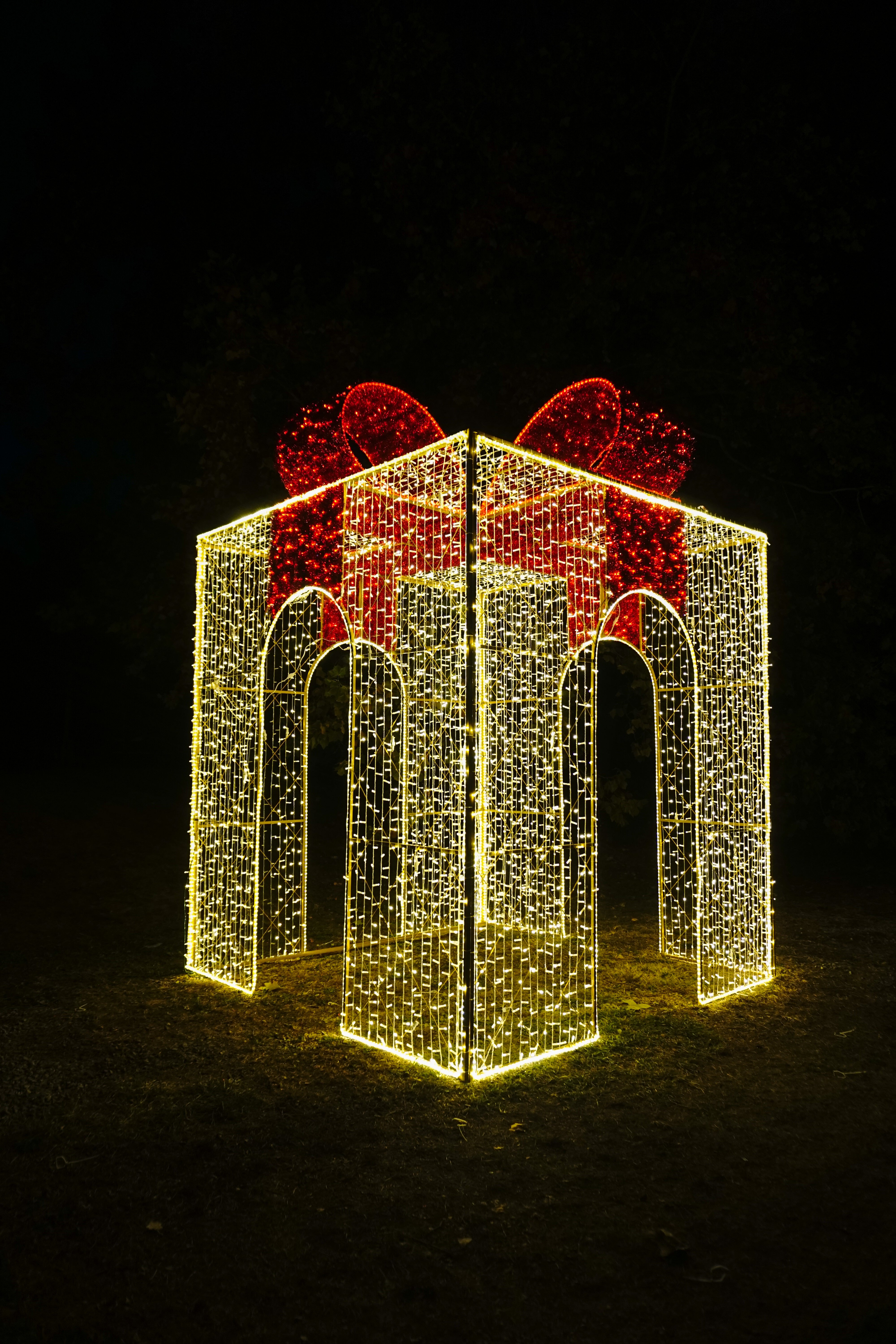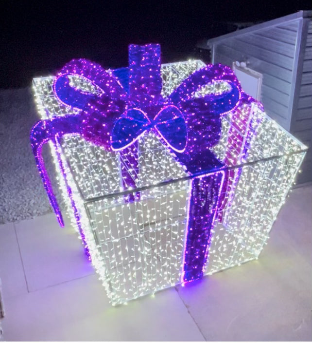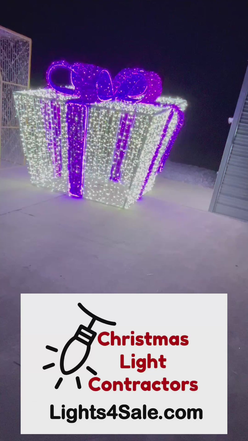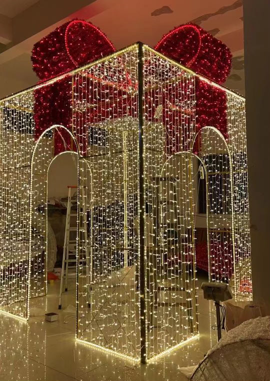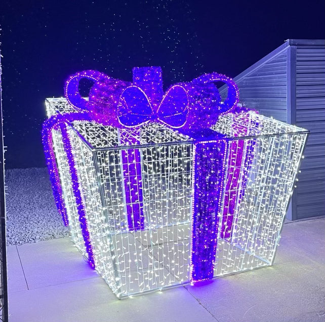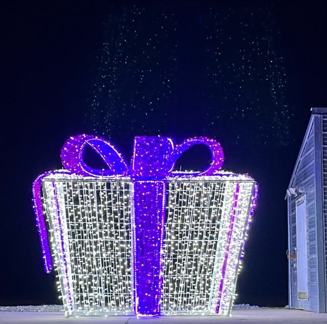 The walk-through gift boxes stand between 10 to 13 feet tall and are perfect for photo opportunities in commercial spaces or civic projects. Choose from warm white boxes adorned with red or purple ribbons. Please note: The 10'x8' size is a 3D gift box and is not meant to be walked through. However, its stunning appearance is sure to impress.